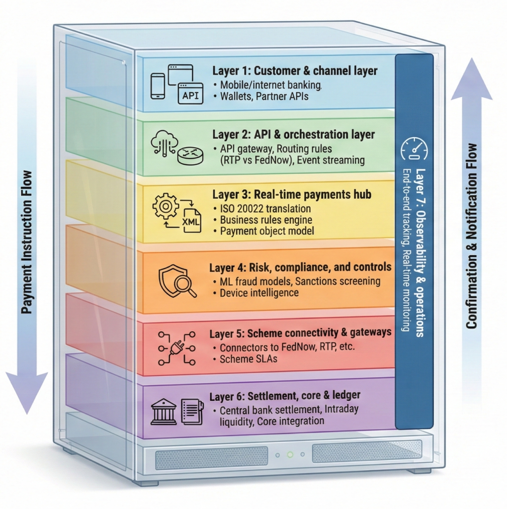 “Real-time payments infrastructure” is not just a faster switch or a new mobile app. It’s an integrated stack of capabilities that must work together in seconds, reliably, 24/7: